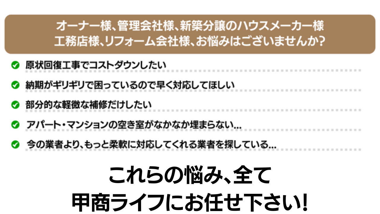 甲商ライフ は埼玉県川口市を中心に原状回復工事と内装リフォーム、リノベーション工事を行う業者です。